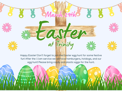 We will have our Easter egg hunt and activities following the 11:00am service. There will be coffee and snacks available in the lobby before the 11am service, so get there early! Following the service we will have food, games, and egg hunts divided by ages for kids 0-12.